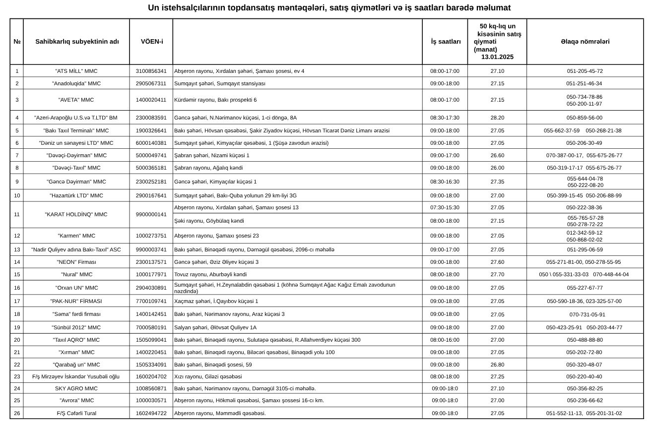 Un istehsalçılarının topdansatış məntəqələri, satış qiymətləri və iş saatları barədə məlumat - 10.01.2025