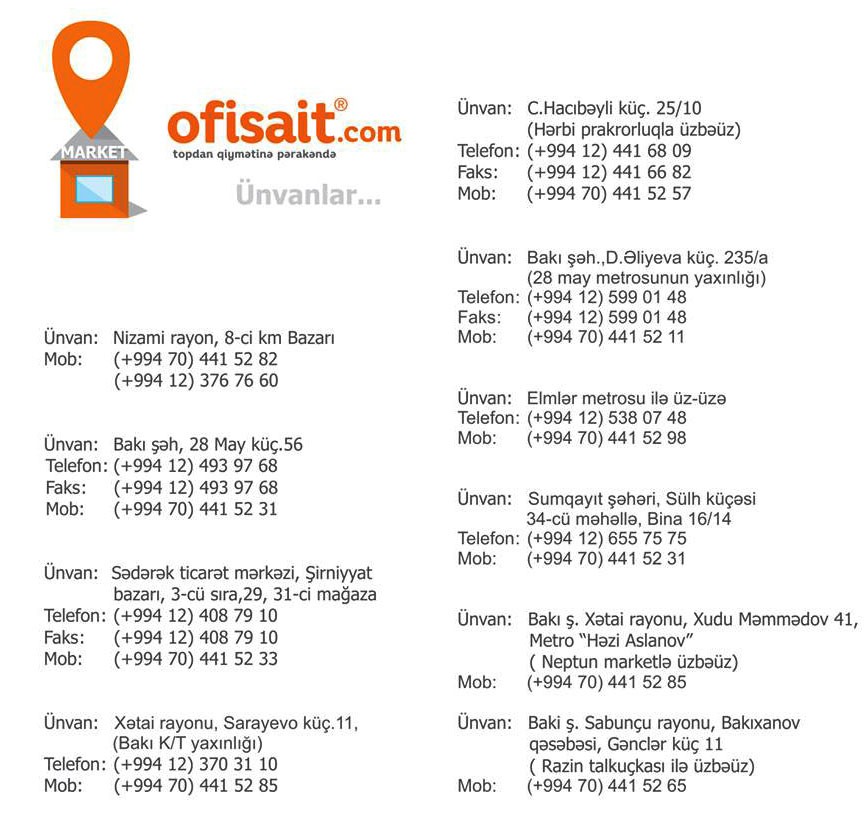 Artıq "Ofisait" mağazaları Bakının bir çox nöqtəsində fəaliyyət göstərdiyindən küçə ticarətçilərindən keyfiyyətsiz məktəb ləvazimatları alamağa ehtiyac yoxdur. Həm pulunuza, həm də vaxtınıza qənaət edərək məktəbli ləvazimatlarını topdansatış qiymətlərinə pərakəndə əldə edə bilərsiniz.