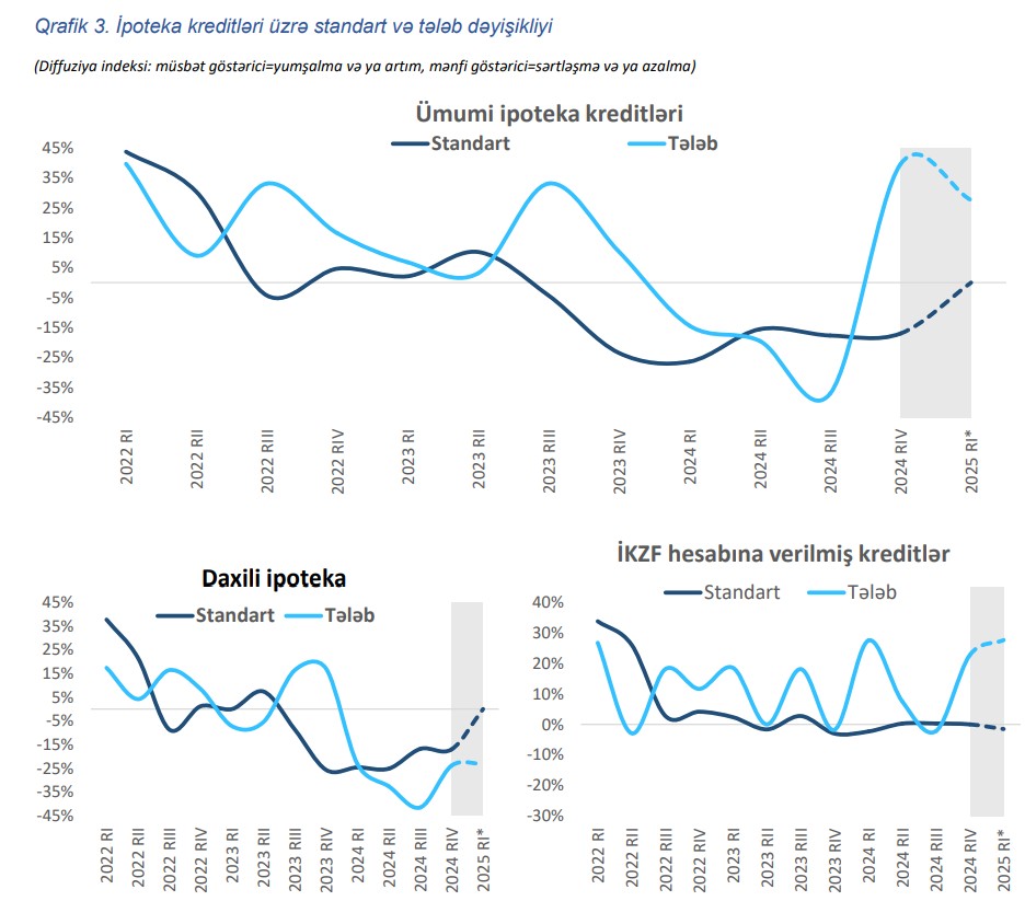 Ötən rübdən fərqli olaraq 2024-cü ilin IV rübündə cəmi ipoteka kreditlərinə tələb artıb. Respondentlərin cavablarına görə tələbdəki artım İKZF hesabına verilən ipoteka kreditləri üzrə müşahidə olunub. Banklar 2024-cü ilin IV rübündə Mənzil İnşaatı Dövlət Agentliyi tərəfindən regiondakı layihələr üzrə evlərin kütləvi satışa çıxarılmasını tələbin artmasına təsir göstərən faktor kimi qeyd edib. Banklar növbəti rübdə İKZF hesabına verilən ipoteka kreditləri üzrə tələbdə artım trendinin davam edəcəyi, daxili ipoteka kreditlərində isə tələbdə azalma olacağı qənaətindədirlər.