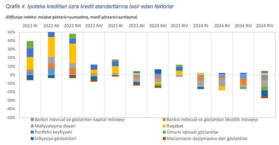 Sorğunun 2024-cü il IV rüb üzrə nəticələrinə əsasən, ipoteka kreditləri üzrə standartlarda sərtləşmə davam edib. Sərtləşmə bankların daxili resurslar hesabına verilən ipoteka kreditləri üzrə olub. Daxili ipoteka kreditləri üzrə standartlarda sərtləşmə əsasən kreditlərin maya dəyərinin artımı formasında olub. İKZF (İpoteka və Kredit Zəmanət Fondu) hesabına verilən ipoteka kredit standartlarında dəyişiklik müşahidə edilməyib. Banklar növbəti rübdə həm İKZF hesabına verilən kreditlər, həm də daxili ipoteka kreditləri üzrə kredit standartlarında dəyişiklik olmayacağını gözləyirlər