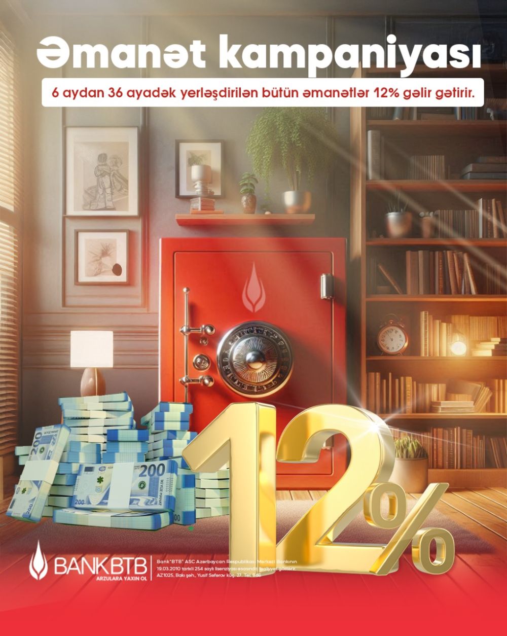 Qeyd edək ki, Bank BTB-də yerləşdirilən əmanətlər Azərbaycan Əmanətlərin Sığortalanması Fondunun qaydalarına uyğun olaraq sığortalanır. Kampaniyanın müddəti 01 Mart 2025-ci il tarixindən 31 May 2025-ci il tarixinədək davam edəcək.