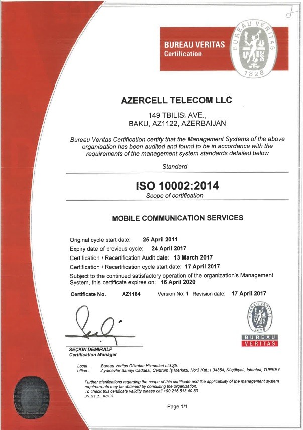 Azercell Telekom MMC növbəti dəfə keyfiyyətin idarəolunması standartı üzrə İSO 10002:2014 sertifikatını alıb.