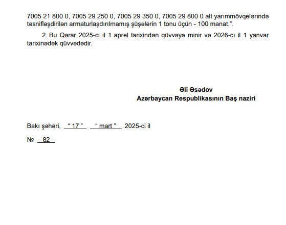 Bu qərar 2025-ci il 1 aprel tarixindən qüvvəyə minir və 2026-cı il 1 yanvar tarixinədək qüvvədədir.