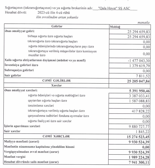 "Qala Həyat Sığorta Şirkəti"nin xalis mənfəəti artıb
