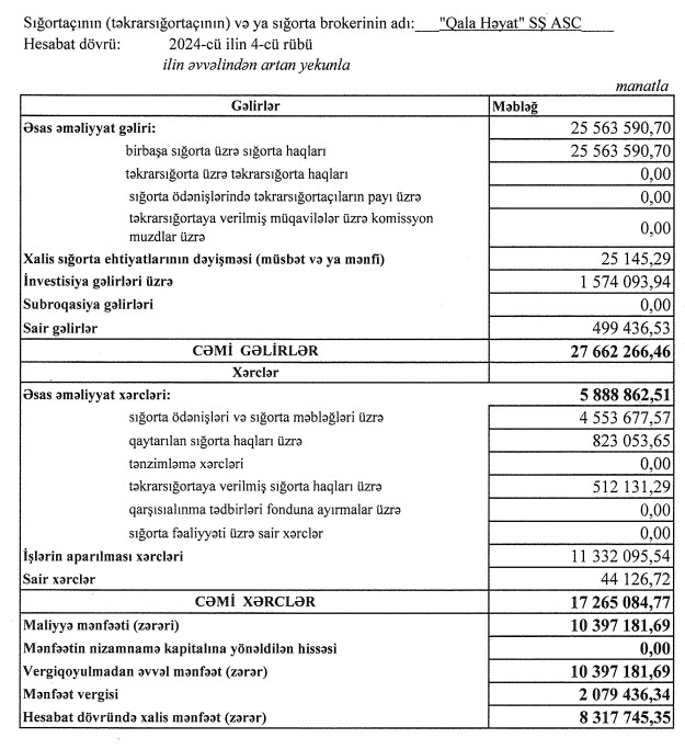 "Qala Həyat Sığorta Şirkəti" ASC 2024-cü ili 8 milyon 318 min manat xalis mənfəət ilə başa vurub. Halbuki, Şirkət 2023-cü ili 7 milyon 941 min manat xalis mənfəət ilə bağlamışdı. Beləliklə,"Qala Həyat Sığorta Şirkəti"nin xalis mənfəəti 2024-cü ildə 2023-cü illə müqayisədə 377 min manat və ya 4,7% artıb.