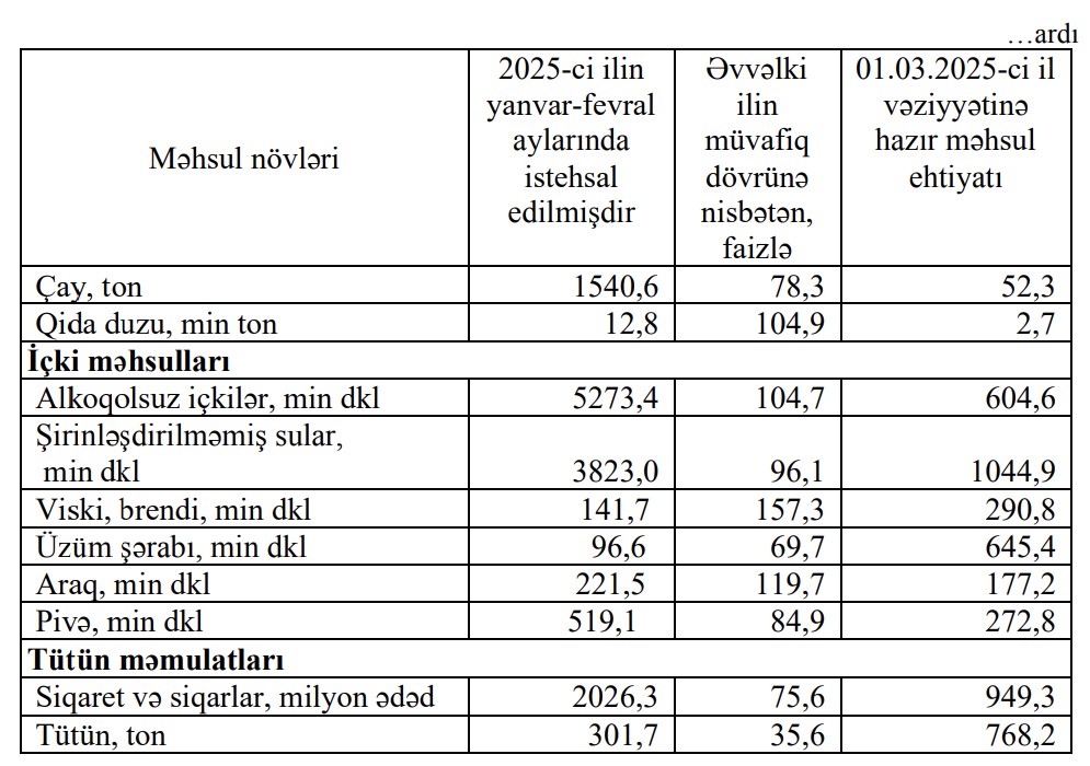 2025-сi ilin yanvar – fevral ayları ərzində, əvvəlki ilin müvafiq dövrü ilə müqayisədə qida məhsullarının istehsalında 10,7 faiz, içki istehsalında 5,4 faiz artım, tütün məmulatlarının istehsalında isə 25,4 faiz azalma müşahidə olunmuşdur.