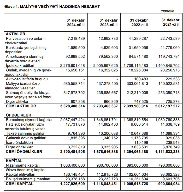 31 dekabr 2024-cü il tarixində Fondun ipoteka kreditləri portfeli 2 milyard 276 milyon 601 min manat, satmaq öhdəliyi ilə kirayə üçün yaşayış sahələri fondu 347 milyon 979 min manat təşkil edib.