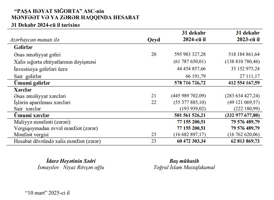 Marja.az Şirkətin 31 Dekabr 2024-cü il tarixinə olan hesabatlarına istinadən xəbər verir ki, “PAŞA Həyat Sığorta”nın ümumi gəlirləri 2023-cü ildə 412 milyon 554 min manat ikən, 2024-cü ildə 578 milyon 717 min manat təşkil edib (166 milyon 163 min manat və ya 40,3% artıb).