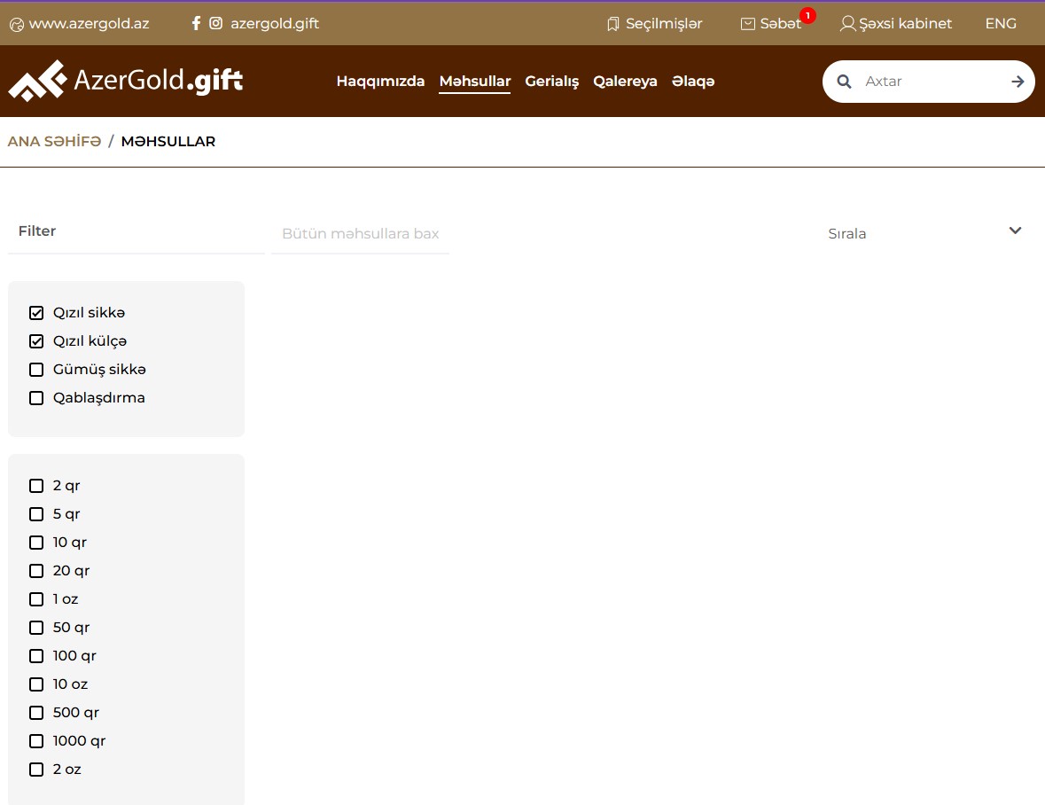 Marja.az xəbər verir ki, azergold.gift saytında "Məhsullar" bölməsində qızıl sikkə və külçə məhsulları barədə məlumatlar yığışdırılıb. Hazırda onlayn şəkildə qızıl məhsulları almaq mümkün deyil.