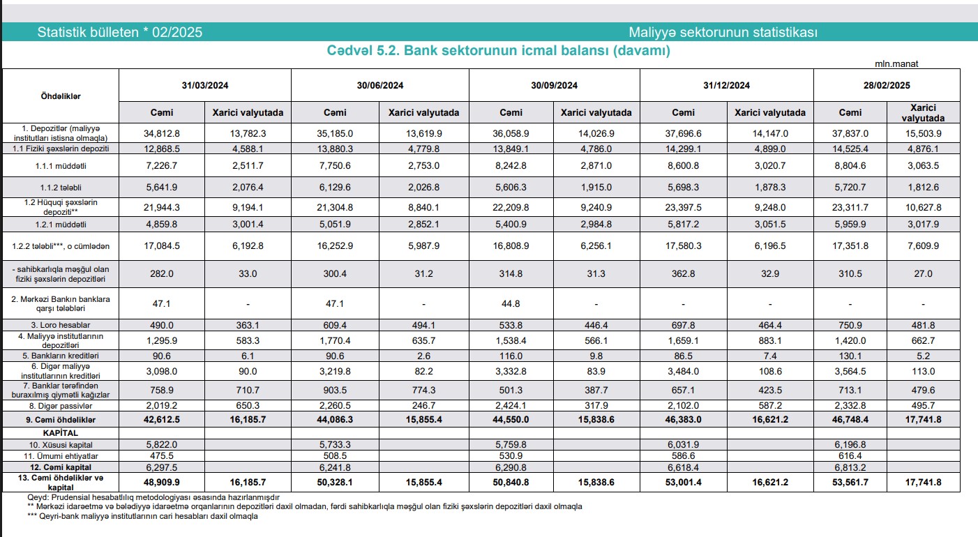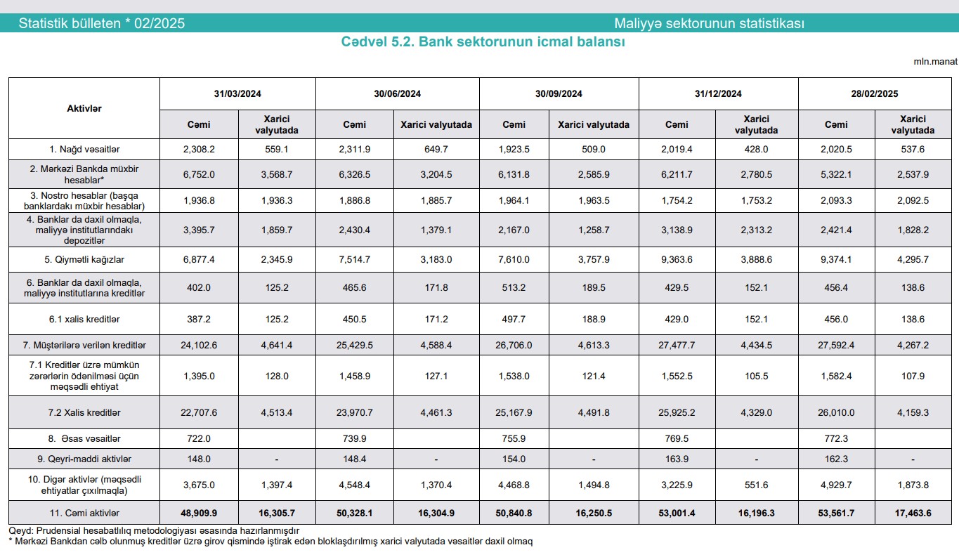 Fəaliyyətdə olan bankların cəmi aktivləri 53 milyard 561.7 miylon manat, cəmi öhdəlikləri 46 milyard 748.4 milyon manat, balans kapitalı 6 milyard 813.2 miylon manat olmuşdur. Fevral ayında bankların cəmi aktivləri 0.9% (470.9 miylon manat), cəmi öhdəlikləri 0.7% (346.1 miylon manat), balans kapitalı isə 1.9% (124.8 miylon manat) artmışdır.