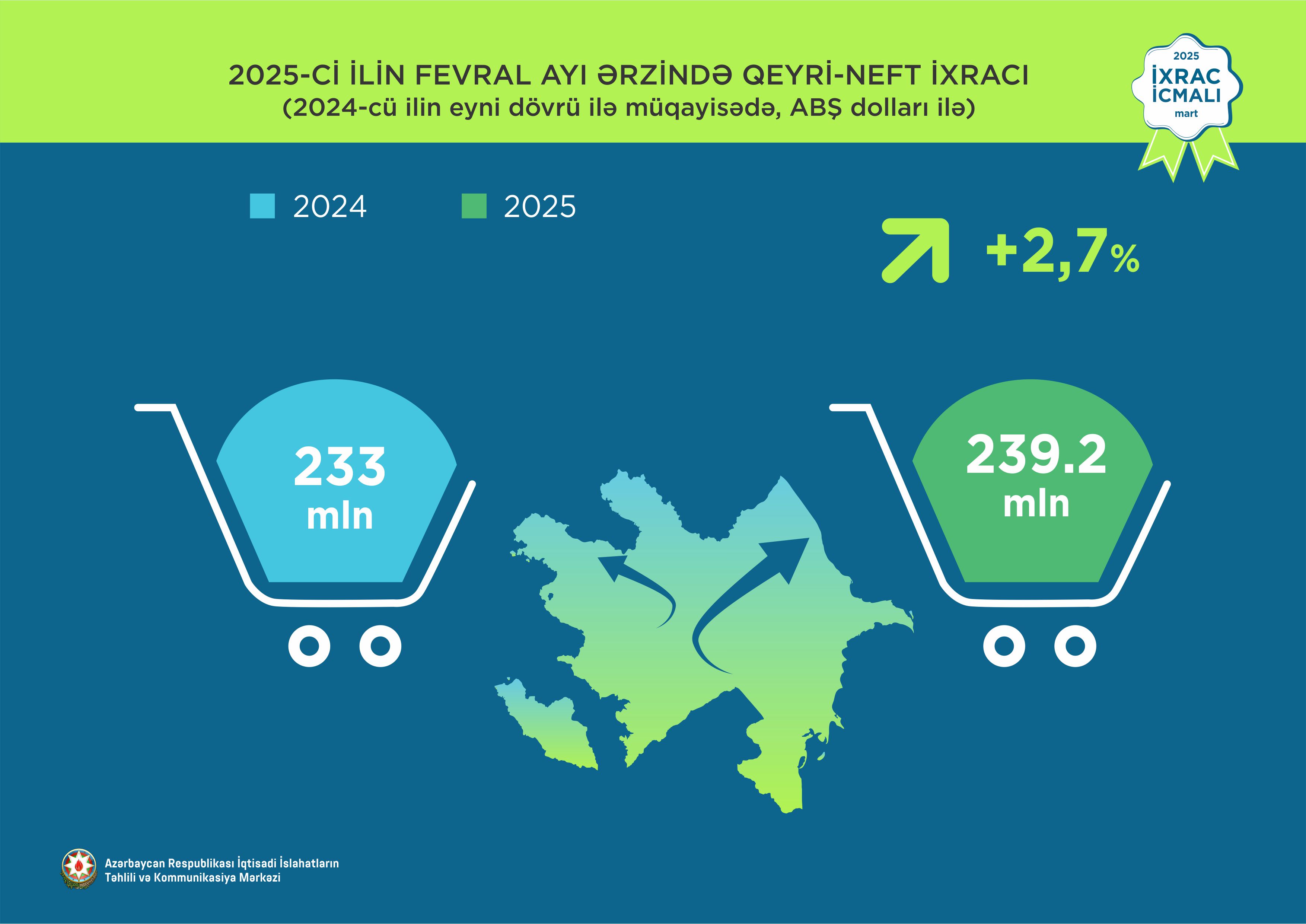 2025-ci ilin fevral ayı ərzində ixrac edilmiş qeyri-neft sektoruna aid malların siyahısında qızıl (19 milyon ABŞ dolları) birinci olub. Bu siyahıda karbamid (15 milyon ABŞ dolları) ikinci, pambıq (14,4 milyon ABŞ dolları) isə üçüncü yerdə qərarlaşıb.