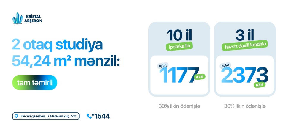 030% ilkin ödəniş və 10 illik ipoteka ilə aylıq 1177 AZN və ya;