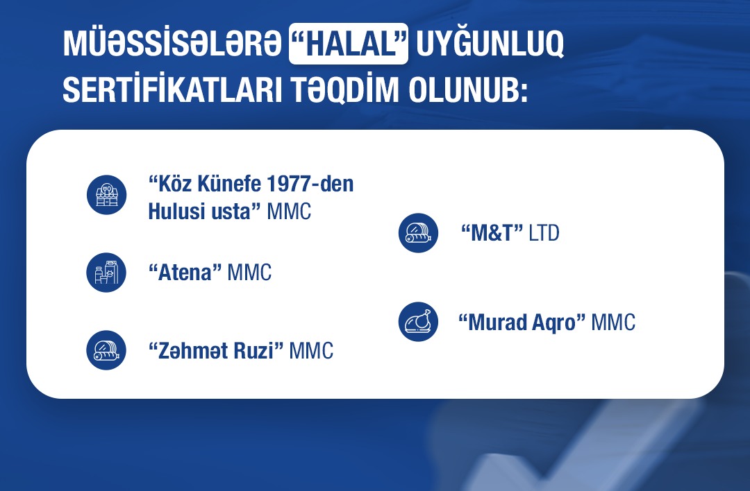Azərbaycan Standartlaşdırma İnstitutunun (AZSTAND) “AZSTANDART Halal” sertifikatlaşdırma orqanı tərəfindən halal sertifikatlaşdırma prosesini uğurla tamamlayan 5 müəssisəyə - paxlava və dondurulmuş künəfə istehsalı üzrə “Köz Künefe 1977-den Hulusi usta” MMC, kolbasa istehsalı üzrə “M&T” LTD və “Zəhmət Ruzi” MMC, süd və süd məhsullarının istehsalı üzrə “Atena” MMC, eləcə də quş əti istehsalı və emalı sahəsində fəaliyyət göstərən “Murad Aqro” MMC -yə “Halal” uyğunluq sertifikatları təqdim olunub.