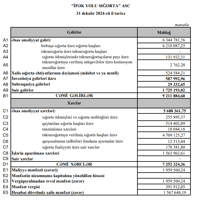"İpək Yolu Sığorta" ASC 2024-cü ili 1 milyon 568 min manat xalis mənfəət ilə başa vurub. Şirkət 2023-cü ili 669 min manat xalis mənfəət ilə bağlamışdı. Beləliklə, "İpək Yolu Sığorta"nın xalis mənfəti 2024-cü ildə 2023-cü illə müqayisədə 898 min manat və ya 2,3 dəfə artıb.