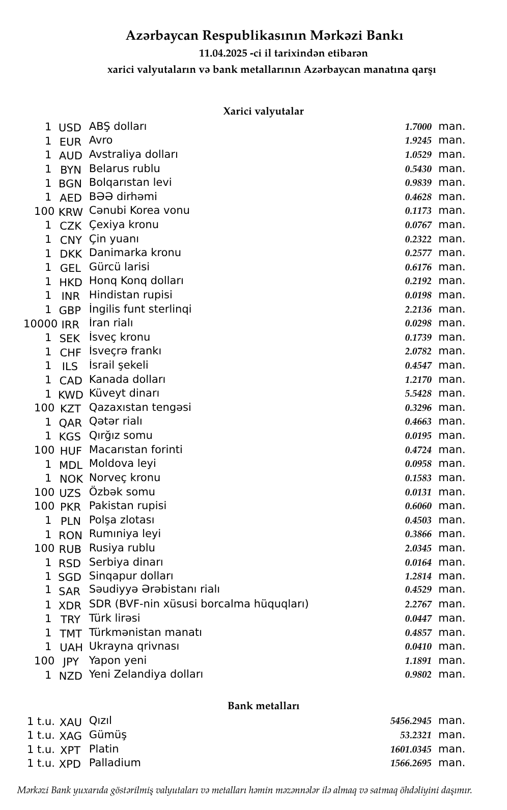 Rəsmi məzənnələr açıqlandı