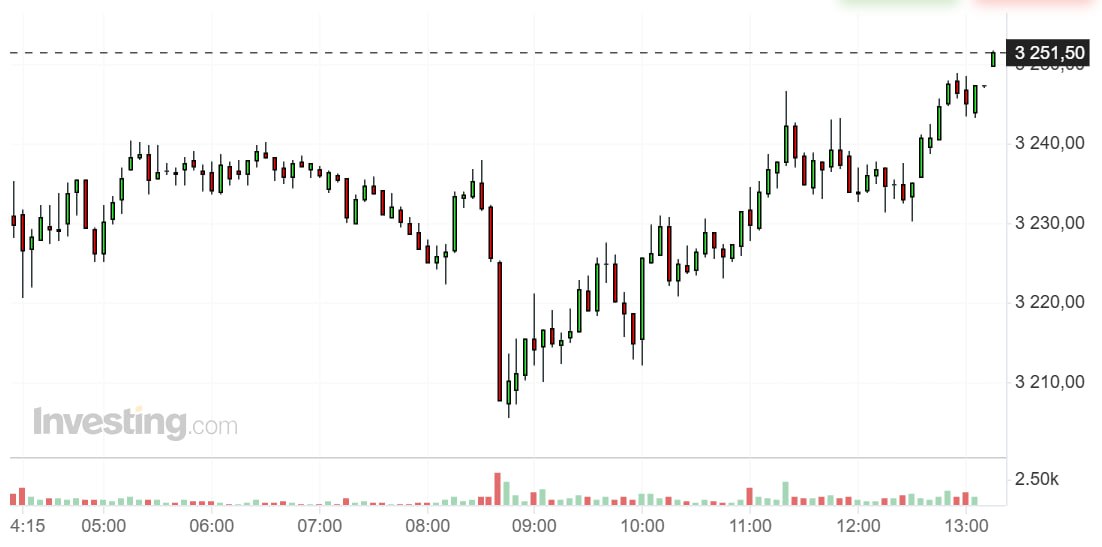 Çikaqo Ticarət Birjasında (CME) qiymətli metalın iyun fyuçersləri 2,45% bahalaşaraq 1 unsiya üçün 3 255,4 dollar olmaqla pik həddinə çatıb. Nyu-York Comex birjasında da iyun ayı qızıl fyuçerslərinin qiyməti troya unsiyası üçün 3250 dolları ötüb.