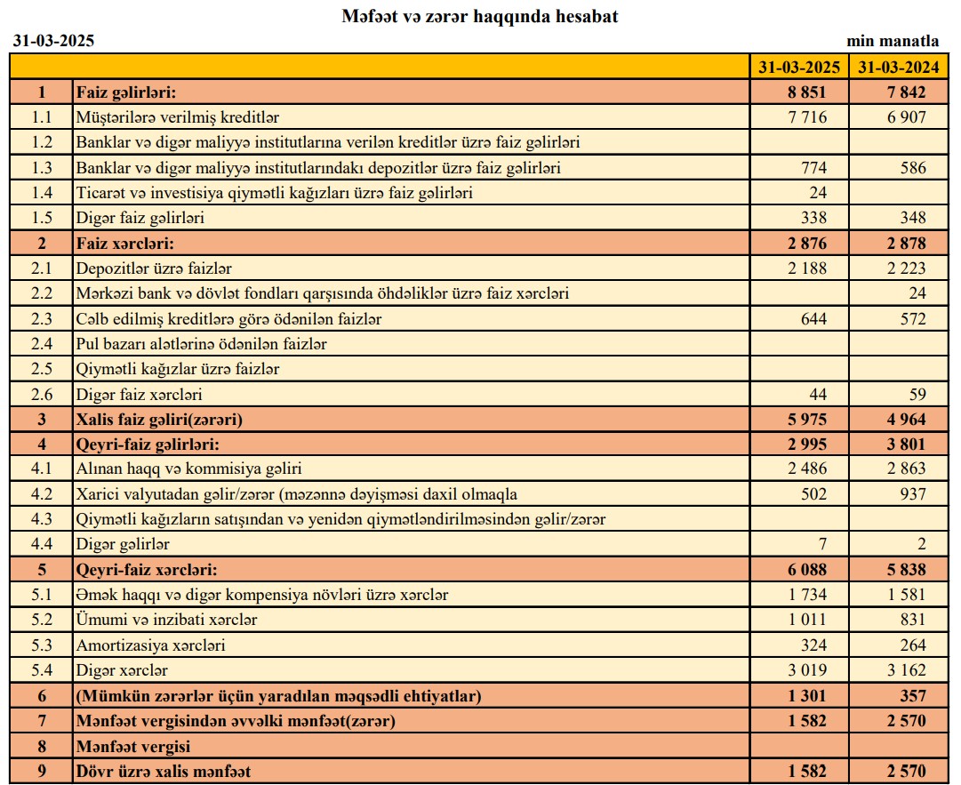 "Premium Bank"ASC 2025-cü ilin 1-ci rübü (yanvar-mart) üzrə maliyyə göstəricilərini açıqlayıb.