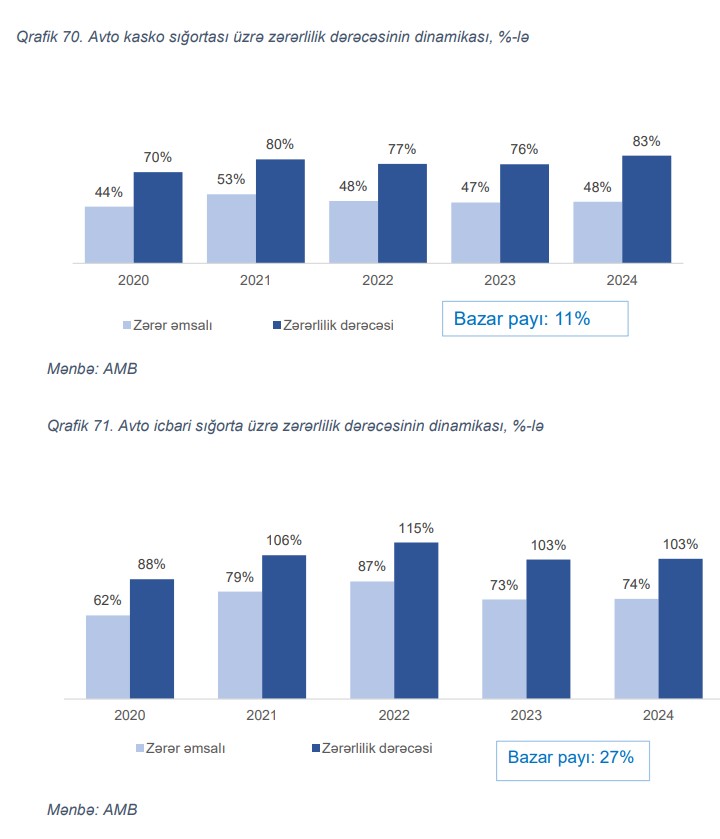 Bazar payı yüksək olan sığorta sinifləri üzrə zərərlilik dərəcəsi yüksəkdir. 2023- cü ilin sonu ilə müqayisədə 2024-cü ilin sonuna avtonəqliyyat vasitəsi sahiblərinin mülki məsuliyyətinin icbari sığortası növü üzrə zərər əmsalı 1 faiz bəndi artsa da, zərərlilik dərəcəsi artmayaraq 103% olmuşdur.