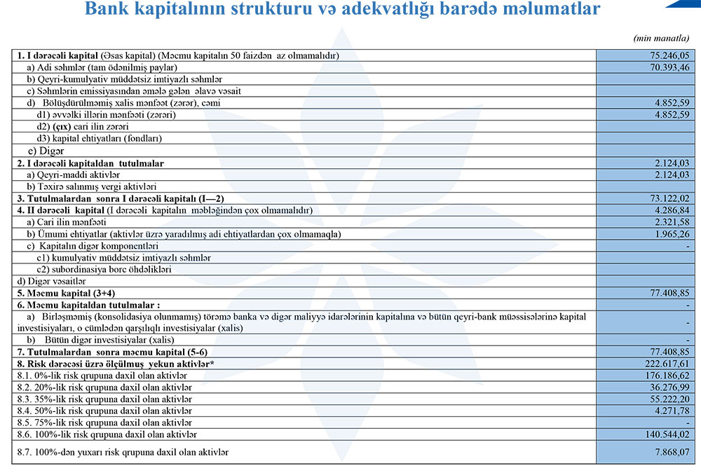 Müqayisə üçün qeyd edək ki, 2024-cü ilin ilk rübündə "AFB Bank" 2 milyon 422 min manat əməliyyat mənfəəti əldə etməsinə baxmayaraq, 2 milyon 879 min manat mümkün zərərlər üçün yaradılan məqsədli ehtiyatlara ayırdığı üçün həmin dövürü 458 min manat zərər ilə bağlamışdı.