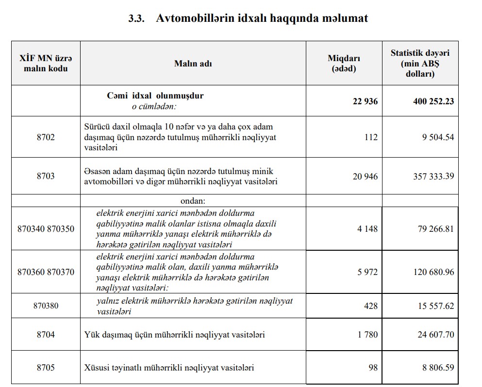 Müqayisə üçün qeyd edək ki, 2024-cü ilin 1-ci rübündə Azərbaycana 361 milyon 23 min dollar dəyərində 19 min 571 ədəd nəqliyyat vasitəsi, o cümlədən 315 milyon 790 milyon dollar dəyərində 17 min 610 ədəd minik avtomobili idxal olunmuşdu.