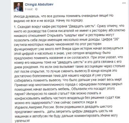 Yazıçı Çingiz Abdullayev “26” kafesi ətrafında yaranan qalmaqala münasibət bildirib.