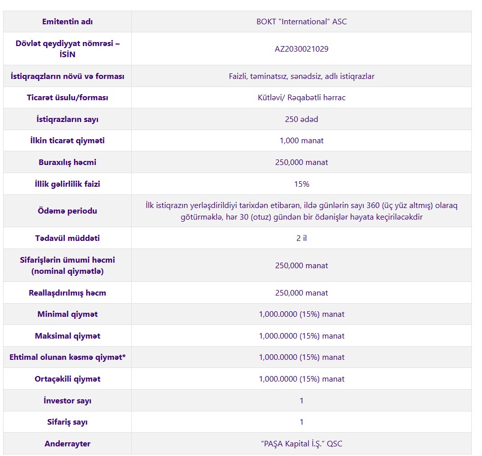 Yeri düşmüşkən qeyd edək ki, 10 aprel 2025-ci il tarixində Bakı Fond Birjasının (BFB) Listinq Komitəsinin qərarı ilə BOKT "International” ASC-nin istiqrazların ticarətə buraxılması üçün “Ticarətə İcazə” qərarı verilmişdir. Qeyd olunan AZ2030021029 ISIN kodlu istiqrazların yerləşdirilməsi üzrə hərrac 22.04.2025-ci il tarixində yekunlaşmışdır.