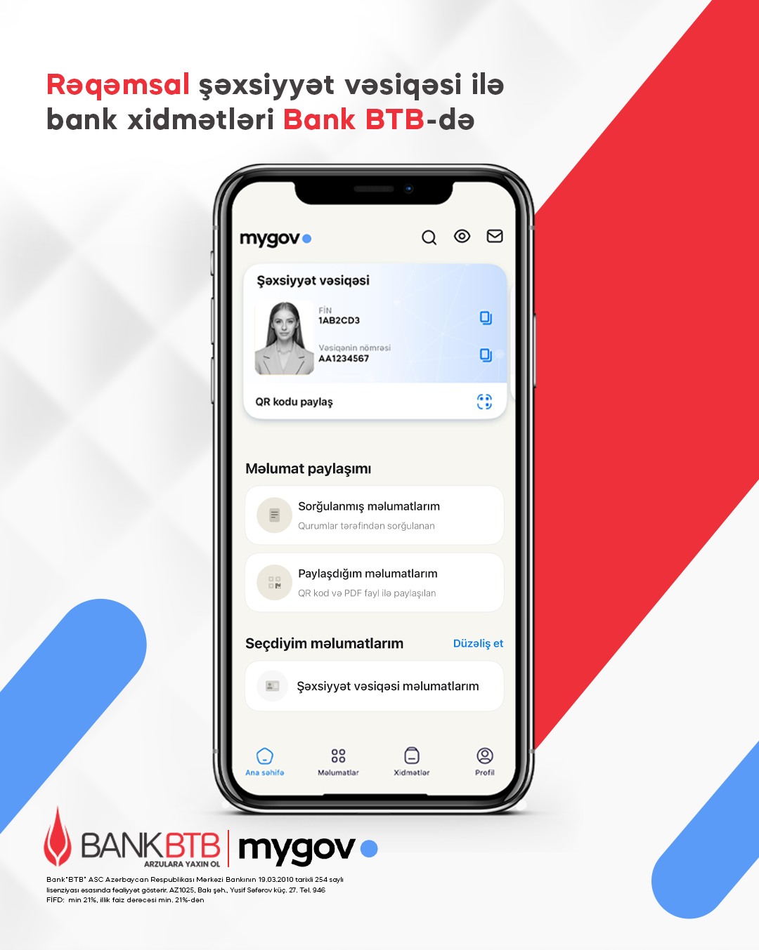 (®) Bank “BTB”, müştərilərin bank əməliyyatlarını daha rahat və operativ həyata keçirə bilmələri üçün rəqəmsal imkanlarını gündən-günə genişləndirməkdədir. Artıq Bank “BTB”-nin bütün filiallarında müştərilər fiziki şəxsiyyət vəsiqəsi təqdim etmədən, "mygov" platforması vasitəsilə rəqəmsal şəxsiyyət vəsiqələrindən istifadə edərək bank xidmətlərindən yararlana biləcəklər.
