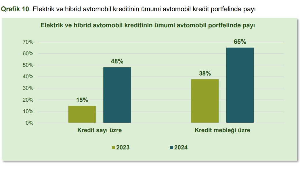 Sənədə əsasən, ötən il elektrik və hibrid avtomobil kreditinin ümumi avtomobil portfelində payı kreditlərin sayı üzrə illik müqayisədə 33 faiz bəndi artaraq 48 %-ə, kreditlərin məbləği üzrə isə 27 faiz bəndi artaraq 65 %-ə çatıb.