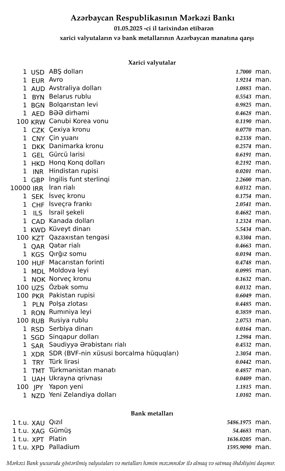 Rəsmi məzənnələr açıqlandı