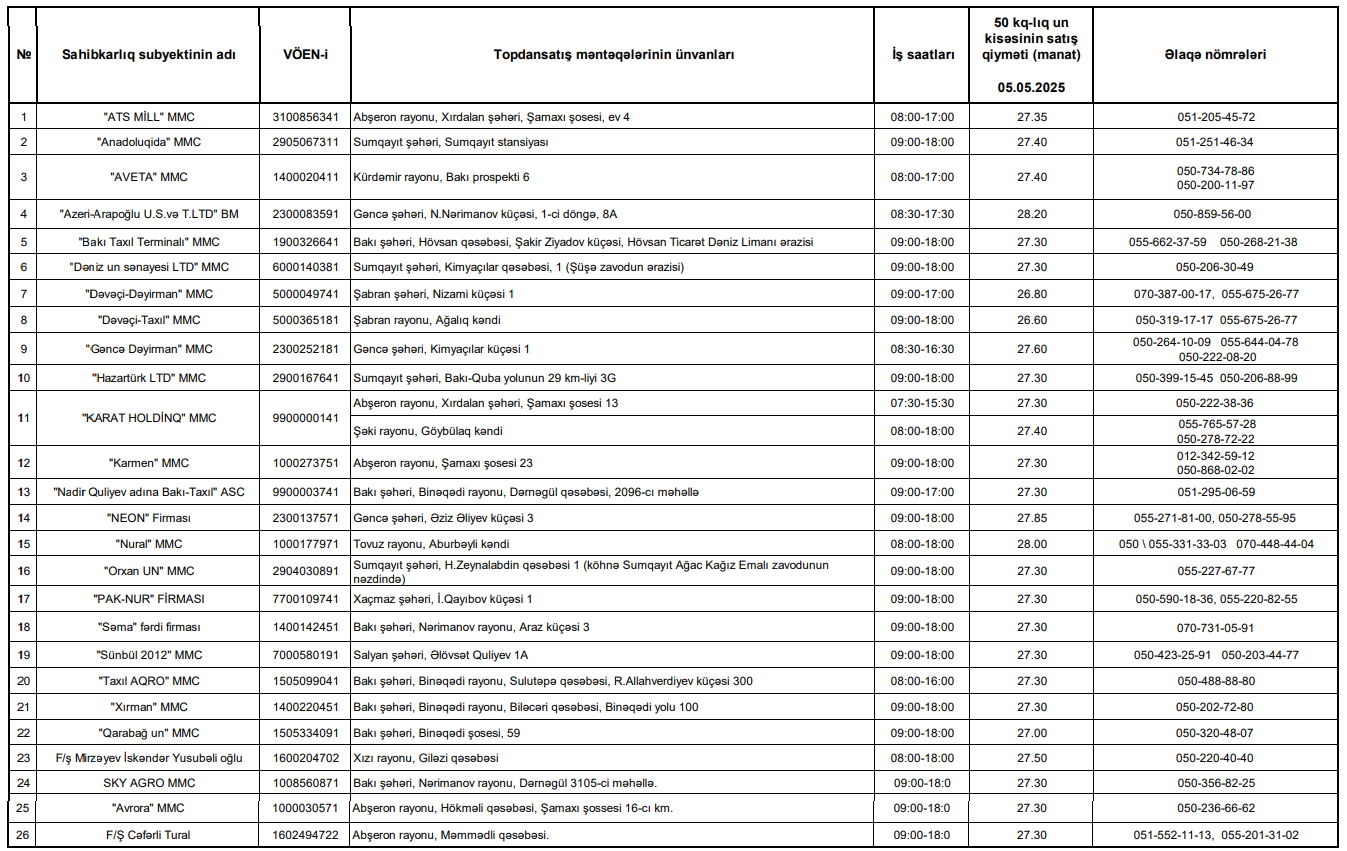 Qeyd edilib ki, mayın 5-də Azərbaycandakı un istehsalçılarının topdansatış məntəqələrində 50 kq-lıq un kisəsinin satış qiyməti 26.6-28.2 manat ətrafında dəyişib.
