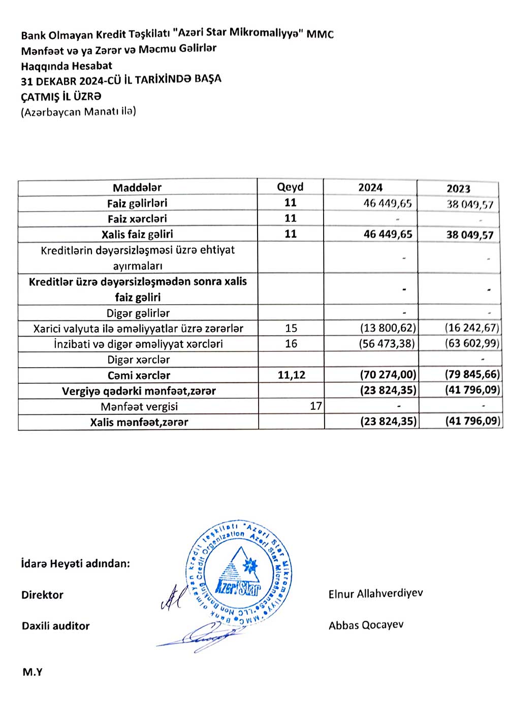 Bank Olmayan Kredit Təşkilatı "Azəri-Star Mikromaliyyə" MMC-nin 31 dekbr 2024-cü il tarixində başa çatmış il üzrə maliyyə hesabatları - ƏTRAFLI