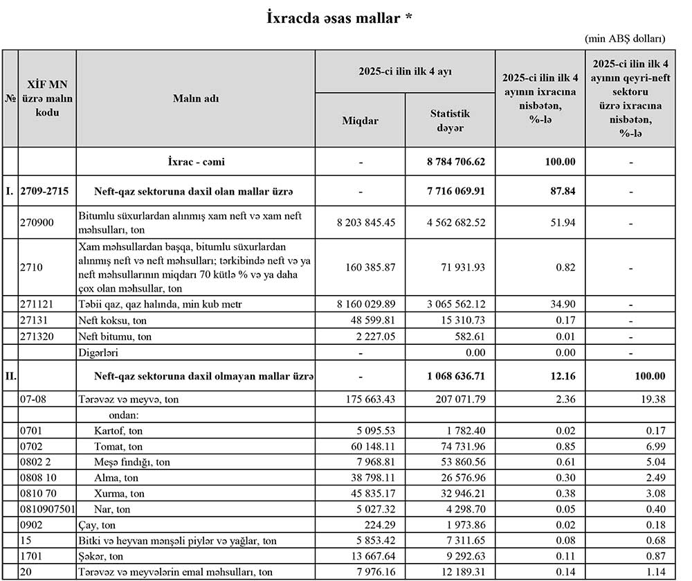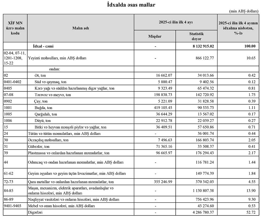 2025-cü ilin yanvar-aprel aylarında (ilk 4 ayda) Azərbaycanın ən çox ixrac və idxal etdiyi mallar.