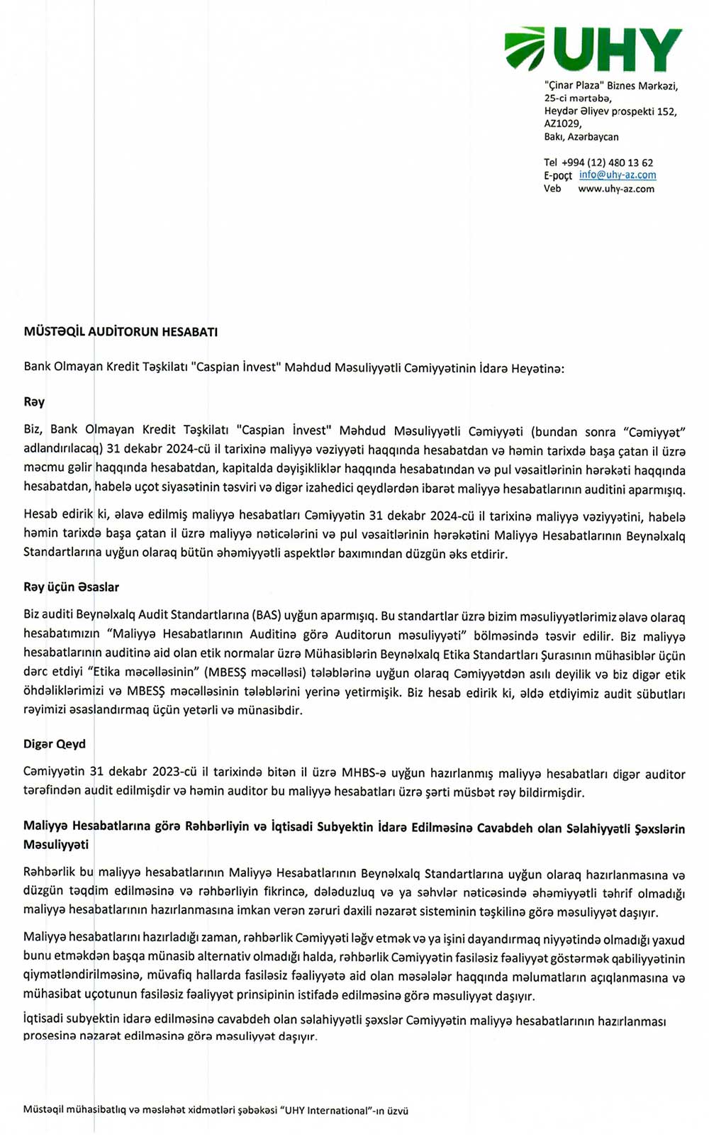 "BANK OLMAYAN KREDİT TƏŞKİLATI CASPİAN İNVEST" MƏHDUD MƏSULİYYƏTLİ CƏMİYYƏTİ 31 dekabr 2024-cü il tarixinə Maliyyə Hesabatlarının Beynəlxalq Standartlarına uyğun hazırlanmış Maliyyə Hesabatları və Müstəqil Auditorların Hesabatı - ƏTRAFLI