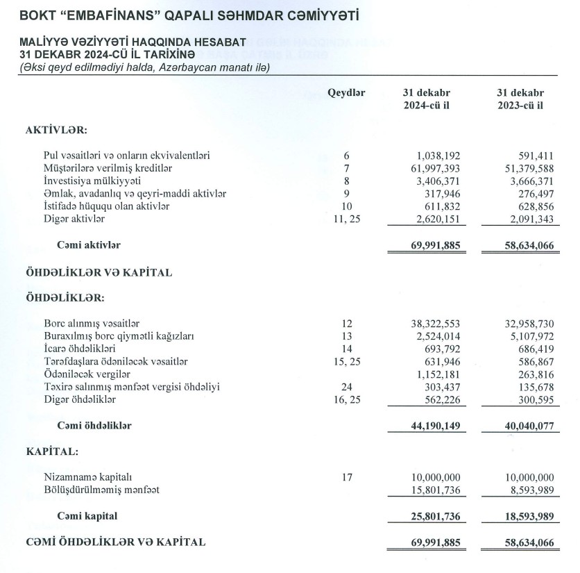 Ötən il "BOKT Embafinans"ın kredit portfeli (müştərilərə verilmiş kreditlər) 10 milyon 618 min manat və ya 20,7% artaraq 31 dekabr 2024-cü il tarixində 61 milyon 997 min manata çatıb. Təşkilat 2023-cü ilin sonunda 51 milyon 380 min manat kredit portfelinə malik idi.