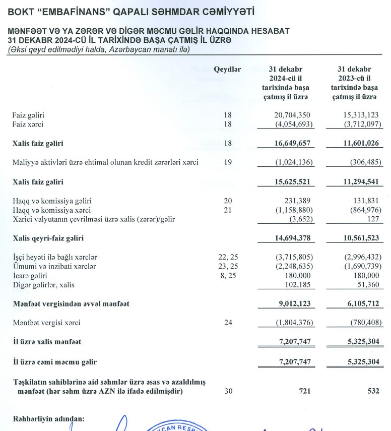 Marja.az "BOKT Embafinans"ın 31 dekabr 2024-cü il tarixində başa çatmış il üzrə maliyyə hesabatlarına istinadən xəbər verir ki, 2023-cü ildə təşkilatın faiz gəlirləri 15 milyon 313 min manat ikən, 2024-cü ildə 20 milyon 704 min manat olub (5 milyon 391 min manat və ya 35,2% artıb). "Embafinans"ın haqq və komissiya gəliri isə 75% artaraq 231 min manat təşkil edib.