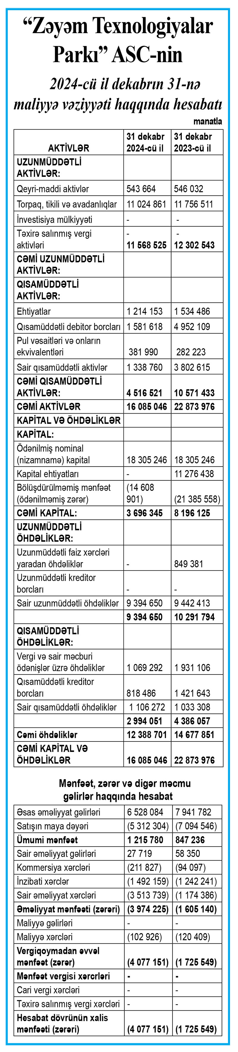 “Zəyəm Texnologiyalar Parkı” ASC 2024-cü ili 4 milyon 77 min manat xalis zərər ilə başa vurub. Şirkət 2023-cü ili 1 milyon 725 min manat xalis zərər ilə bağlamışdı. Beləliklə, 2024-cü ildə 2023-cü illə müqayisədə “Zəyəm Texnologiyalar Parkı”nın xalis zərəri 2 milyon 352 min manat və ya 2,4 dəfə artıb.