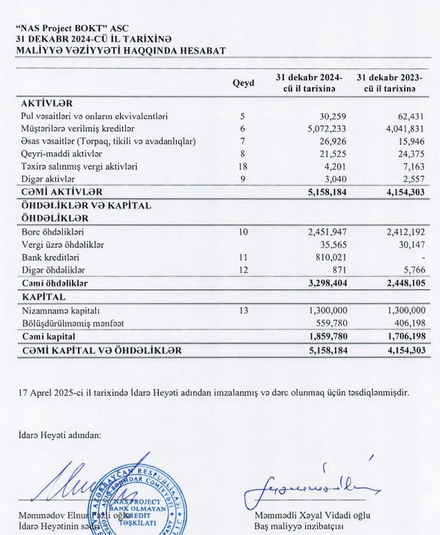 2024-cü ildə "NAS Project BOKT"ın kredit portfeli (müştərilərə verilmiş kreditlər) 1 milyon 30 min manat və ya 25,2% artaraq 31 dekabr 2024-cü il tarixində 5 milyon 72 min manata çatıb.