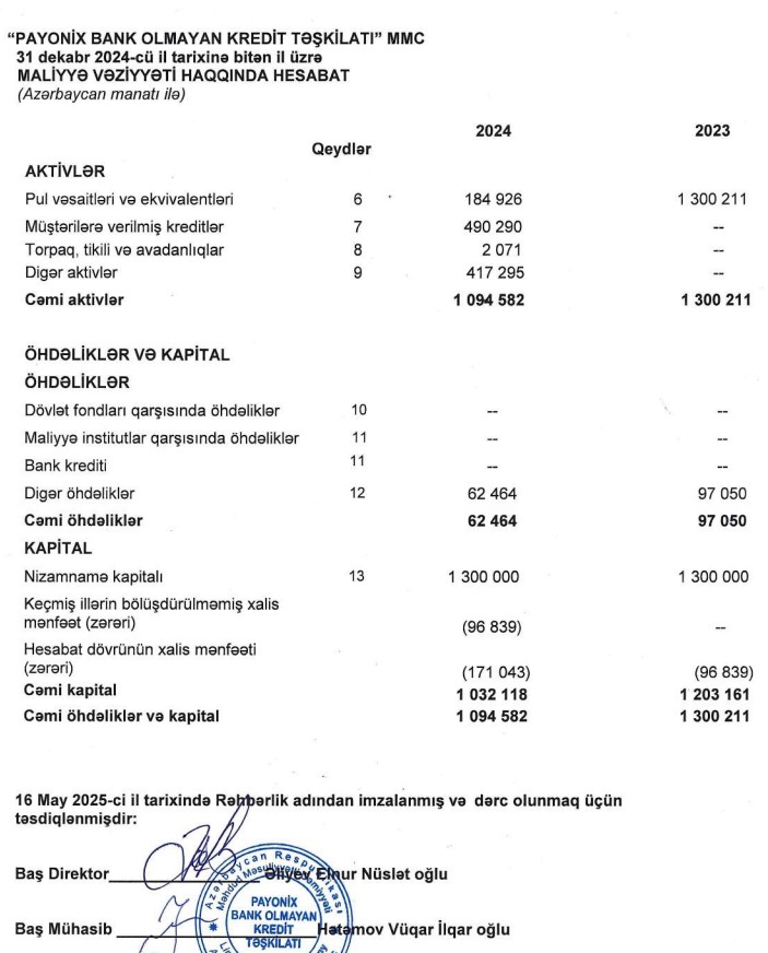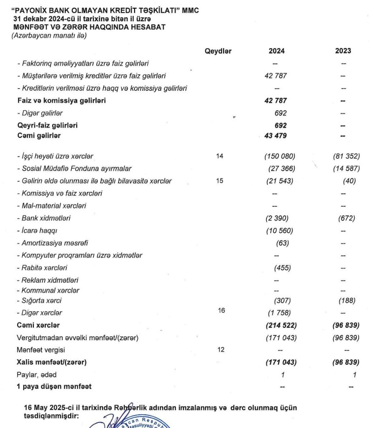"PAYONİX Bank Olmayan Kredit Təşkilatı" MMC 2024-cü ili 171 min manat xalis zərər ilə başa vurub. Təşkilat 2023-cü ili 97 min manat xalis zərər ilə bağlamışdı. Beləliklə, "PAYONİX BOKT"ın xalis zərəri 97 min manat və ya 43,3% artıb.