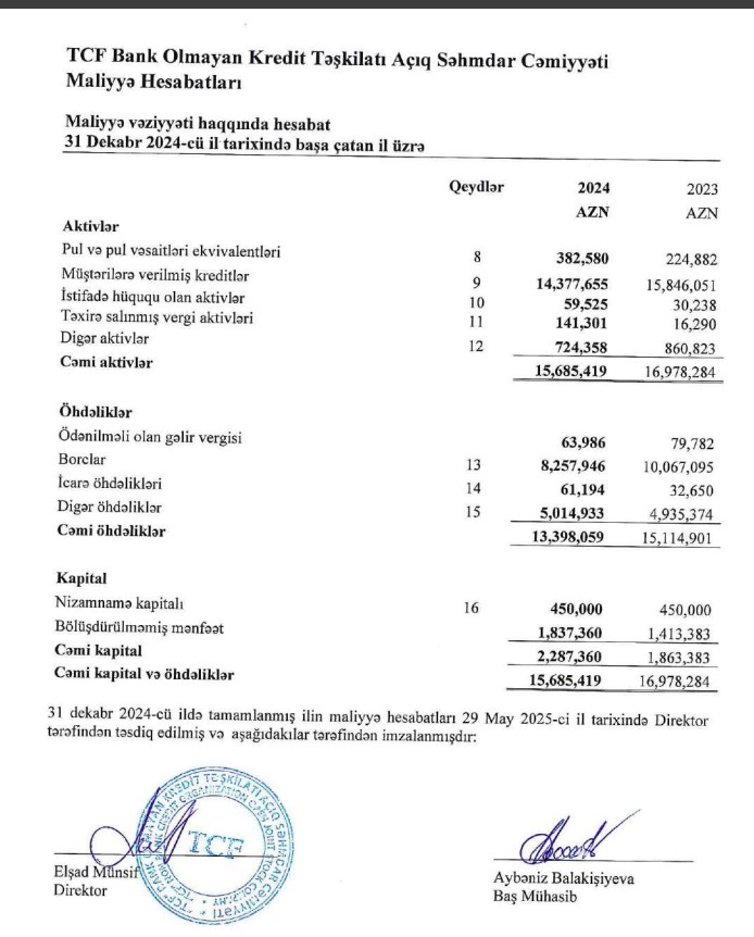 Keçən il "TCF" BOKT ASC-nin kredit portfeli (müştərilərə verilmiş kreditlər) 1 milyon 468 min manat və ya 9,3% azalaraq 14 milyon 378 min manata geriləyib. 2023-cü ilin sonunda "TCF" BOKT-ın kredit portfeli 15 milyon 846 min manata çatmışdı.