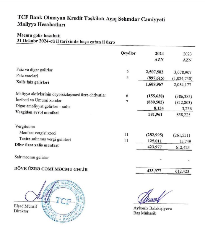 "TCF" BOKT ASC 2024-cü ili 424 min manat xalis mənfəət ilə başa vurub. Təşkilat 2023-cü ili 612 min manat xalis mənfəət ilə bağlamışdı. Beləliklə, "TCF" BOKT-ın xalis mənfəəti 2024-cü ildə 2023-cü illə müqayisədə 188 min manat və ya 30,7% azalıb.