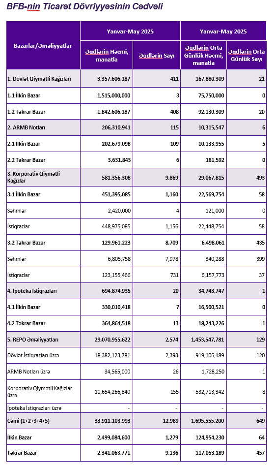 2025-ci ilin yanvar-may ayları ərzində Bakı Fond Birjasının ticarət dövriyyəsi 33 milyard 911 milyon 104 min manat təşkil eib.
