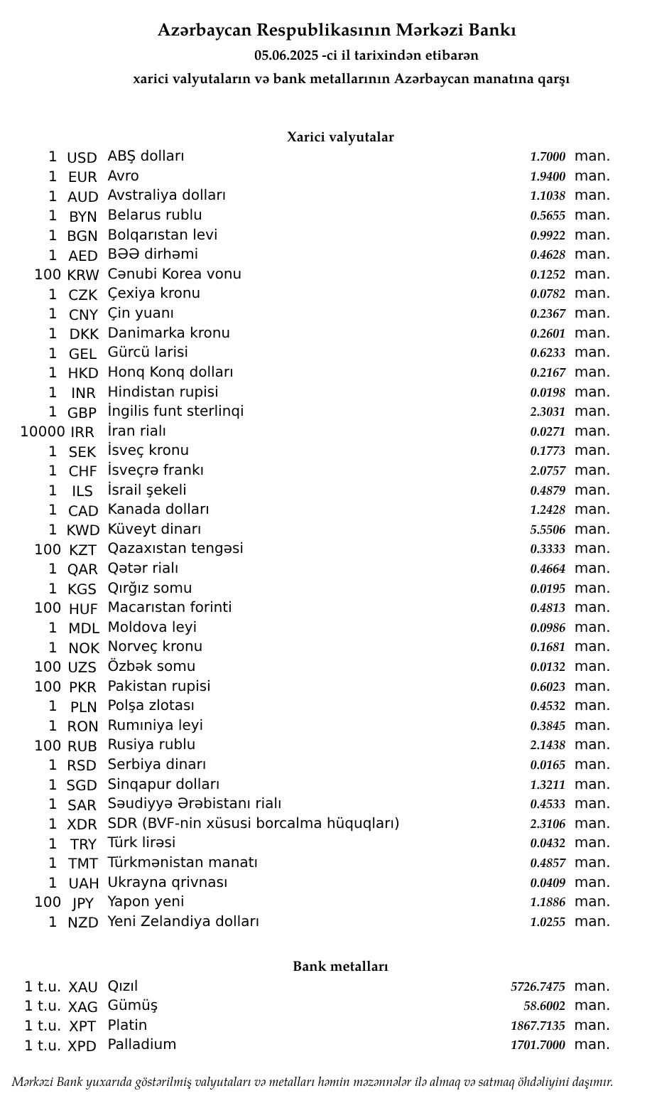 Rəsmi məzənnələr açıqlandı