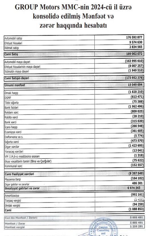 Azərbaycanın avtomobil biznesilə məşğul olan şirkəti gəlir və mənfəətini açılayıb - 189 MİLYON MANAT GƏLİR
