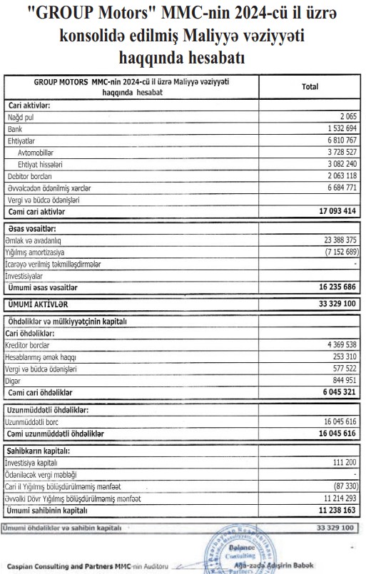 "Group Motors" MMC 31 dekabr 2024-cü il tarixində 33 milyon 329 min manat cəmi akivlərə malik olub.