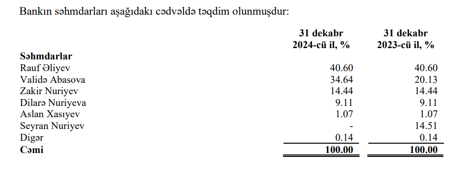 31 dekabr 2024-cü il tarixində 102 milyon 47 min manat nizamnamə kapitalına malik olmuş “Rabitəbank” ASC-nin səhmdarları Rauf Əliyev (40.60%), Validə Abasova (34.64%), Zakir Nuriyev (14.44%), Dilarə Nuriyeva (9.11%), Aslan Xasıyev (1.07%) və digərləri (0.14%) olub.