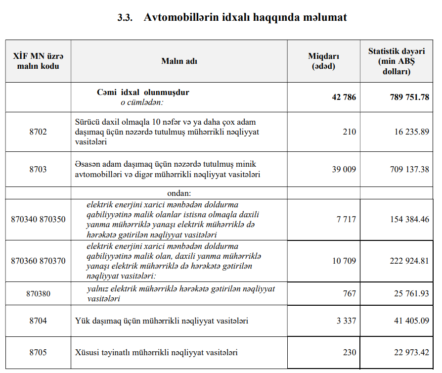 2025-ci ilin ilk 5 ayı ərzində (yanvar-may) Azərbaycana 789 milyon 752 min dollar dəyərində 42 min 786 ədəd nəqliyyat vasitəsi (avtomobil) idxal olunub.