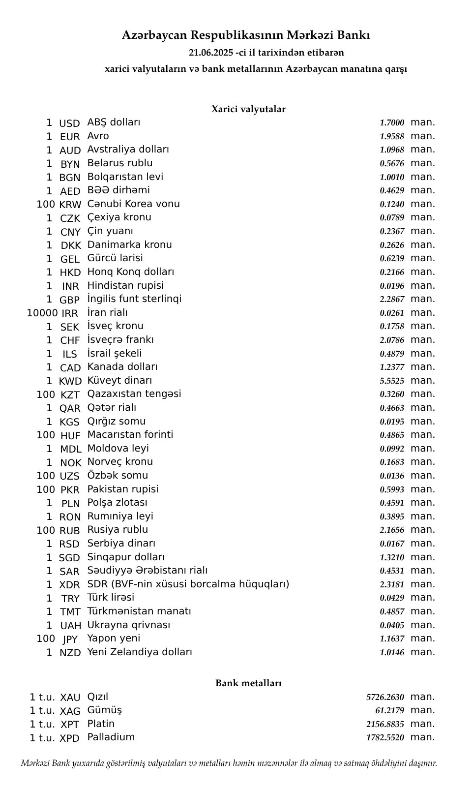 Rəsmi məzənnələr açıqlandı