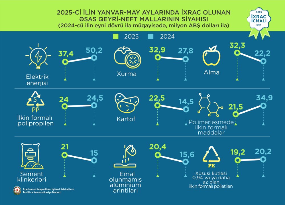 2025-ci ilin may ayında isə ixrac edilmiş qeyri-neft sektoruna aid malların siyahısında pomidor (tomat) (39,1 milyon ABŞ dolları) birinci olub. Bu siyahıda pambıq (27.2 milyon ABŞ dolları) ikinci, qızıl (25,9 milyon ABŞ dolları) üçüncü yerdə qərarlaşıb.