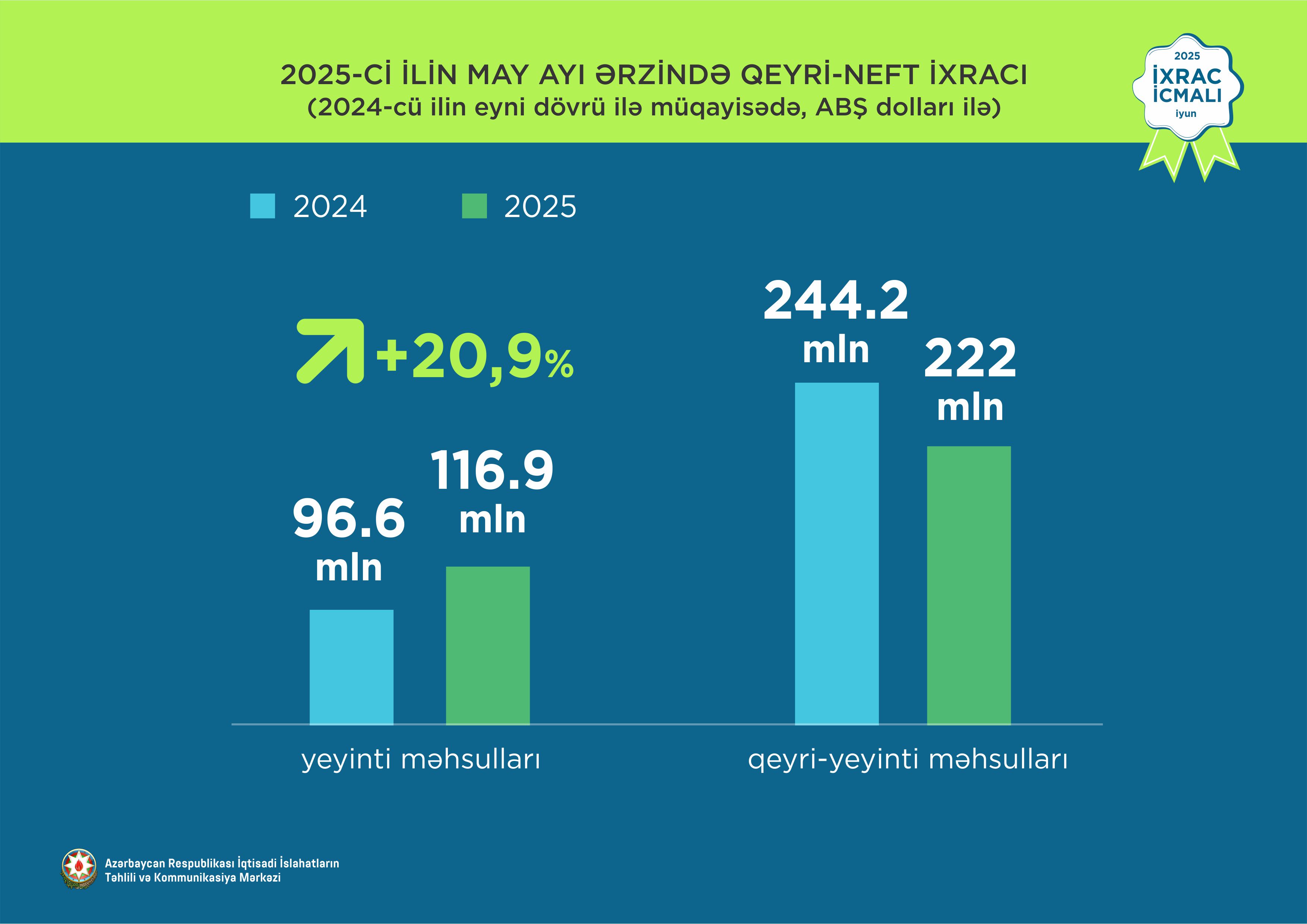 Marja.az İcmala istinadən xəbər verir ki,, 2025-ci ilin yanvar-may aylarında Azərbaycanın qeyri-neft sektoru üzrə ixracı 2024-cü ilin müvafiq dövrü ilə müqayisədə 11.6% artaraq 1,4 milyard ABŞ dolları təşkil edib. Bu dövrdə yeyinti məhsullarının ixracı 14,4% artaraq 417.7 milyon ABŞ dollarına bərabər olub.