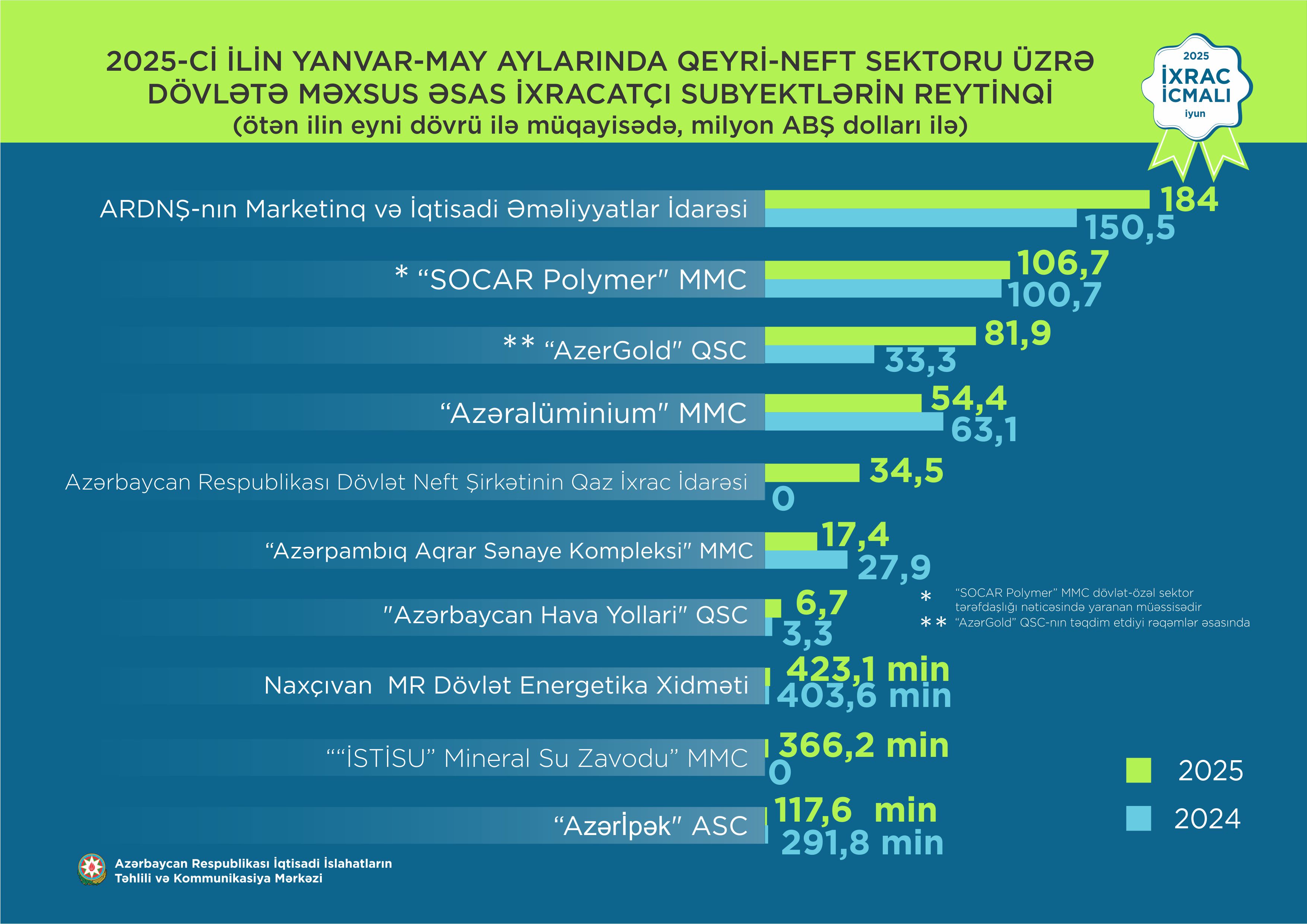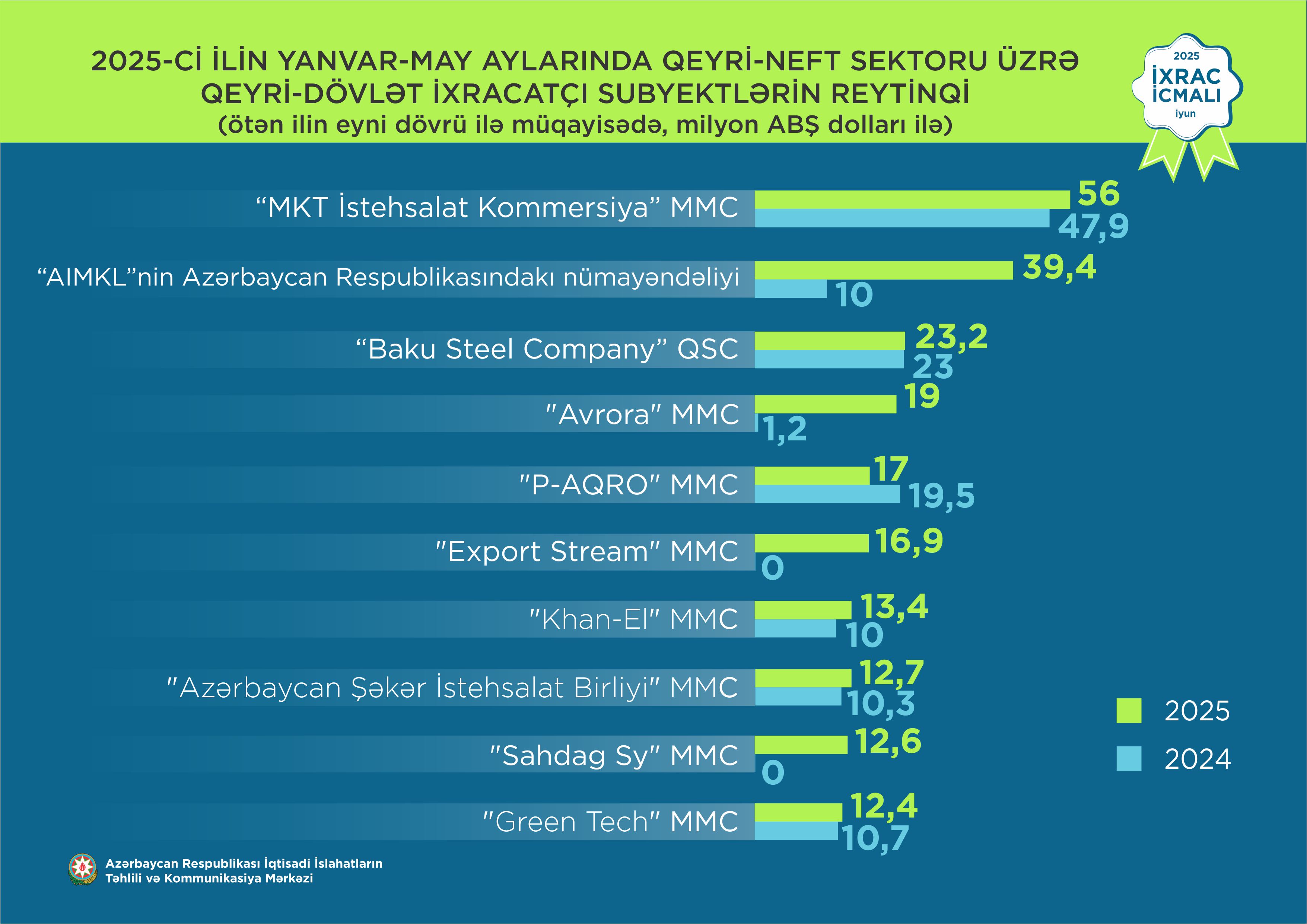 Marja.az xəbər verir ki, 2025-ci ilin yanvar-may ayları üzrə hazırlanmış qeyri-dövlət ixracatçı subyektlərin reytinqində ilk onluqda aşağıdakı şirkətlər təmsil olunublar: